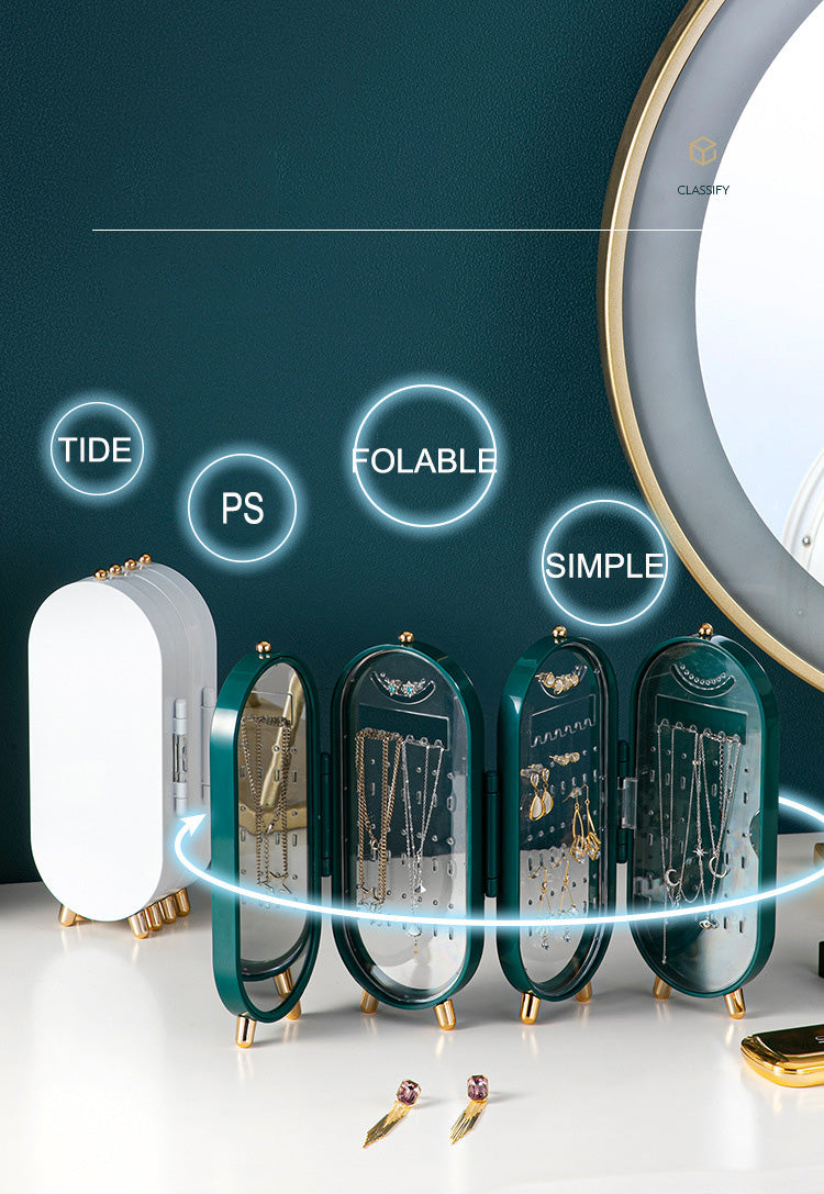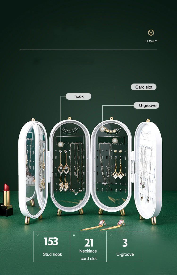 Made from durable ABS material and fitted with a high-definition mirror, this portable jewelry box unfolds like a screen for easy viewing and selection. When not in use, simply fold it to a compact size that fits easily in drawers, suitcases, or on your vanity.