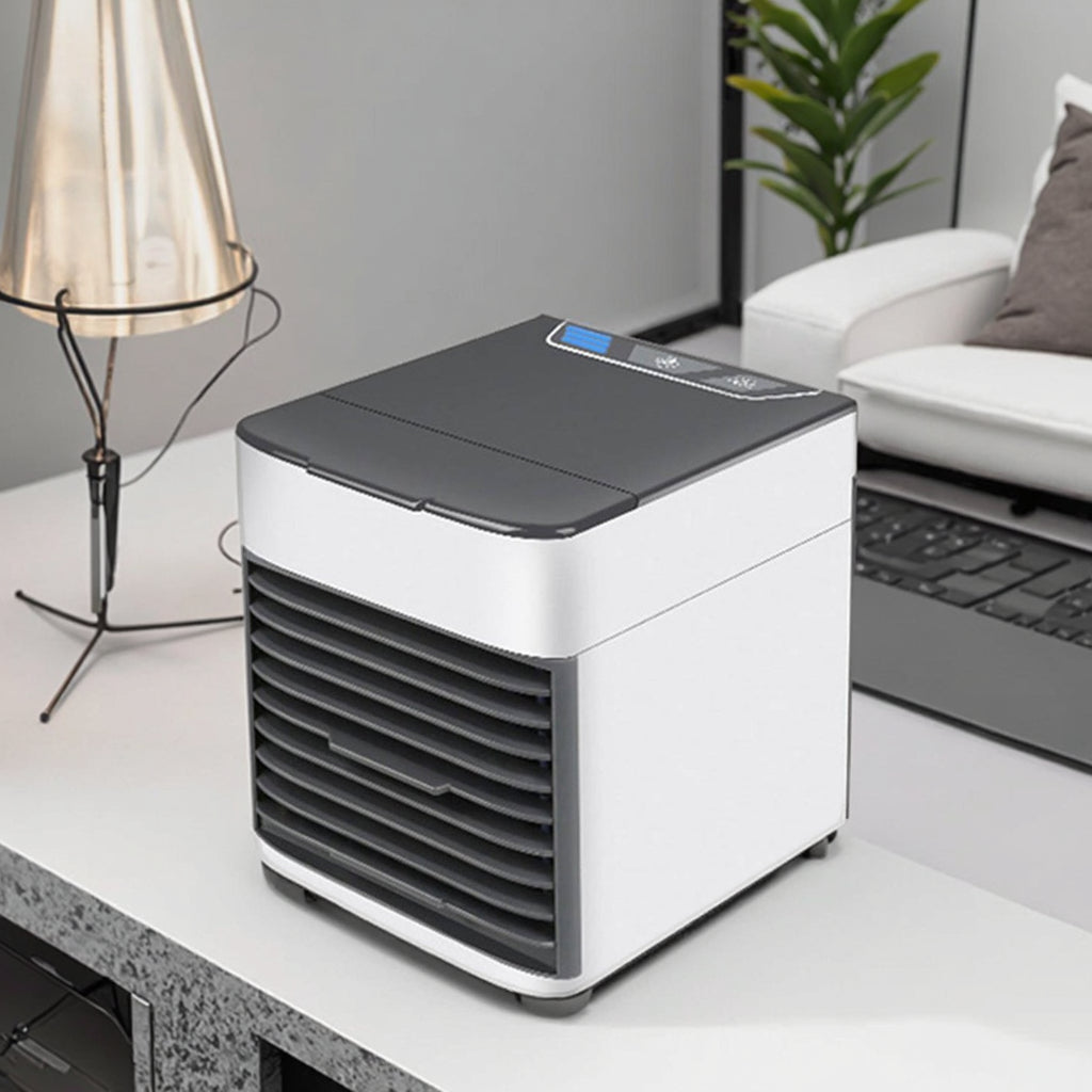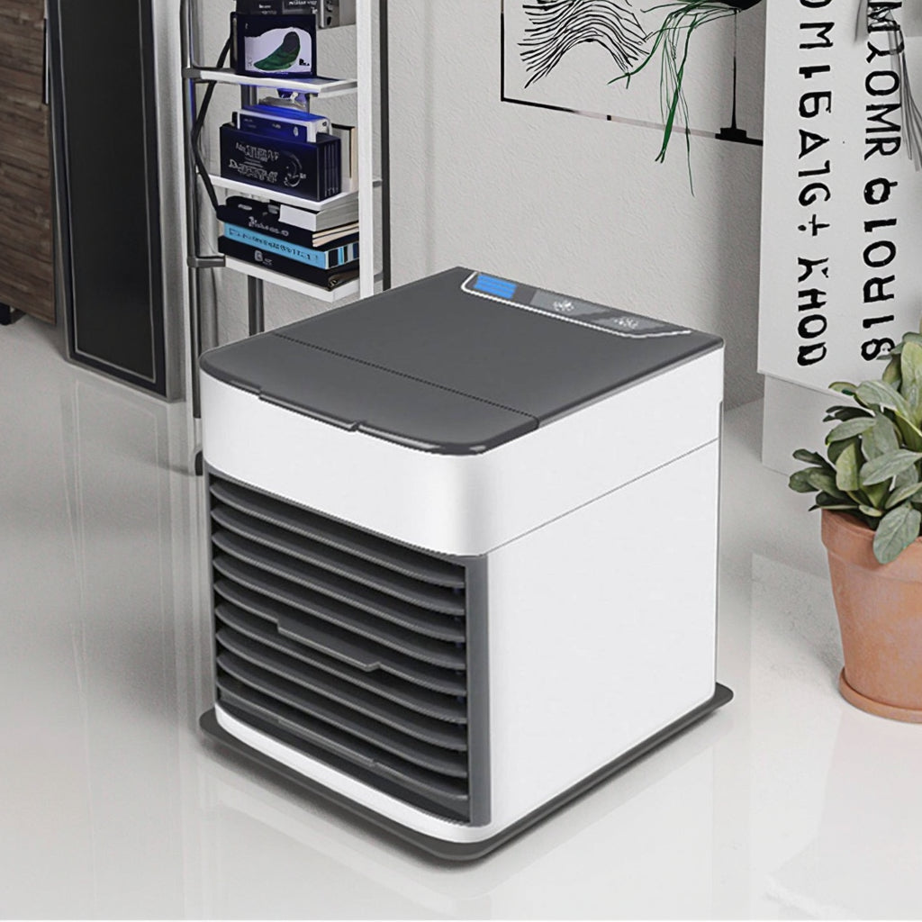 Beat the summer heat with the Mini Portable Air Cooler. Your perfect compact cooling companion! Designed with advanced Arctic Air Ultra Technology, this mini air conditioner works as a portable air cooler, humidifier, and air purifier in one. Whether you're working in the office, relaxing at home, or on the move, this energy-efficient cooling fan offers powerful airflow and soothing comfort with its whisper-quiet operation and built-in water tank for long-lasting cool air.